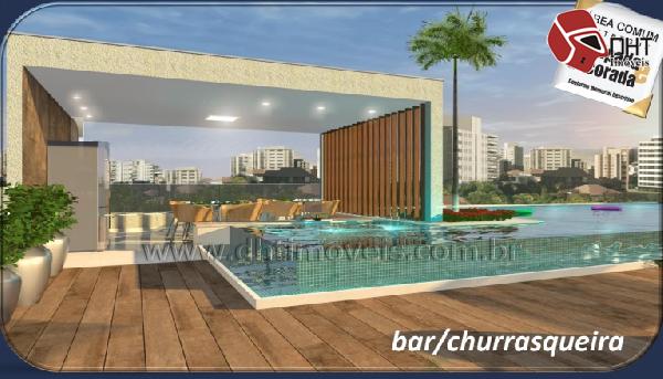 Piscina no pavimento superior, com borda infinita, raia para natação, deck molhado, churrasqueira com bar molhado e spa