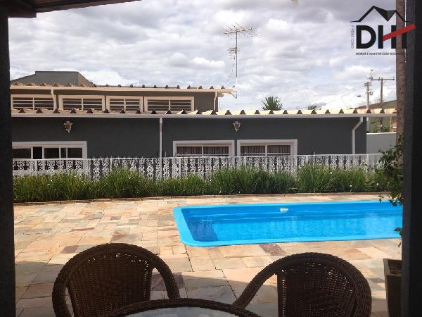 Amplo quintal com jardim, pergolado, canil e área de churrasco com banheiro e piscina.
