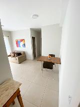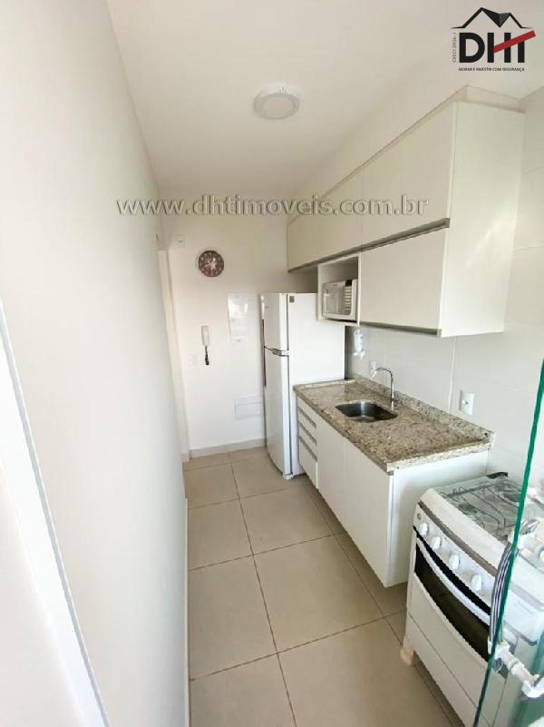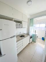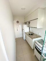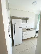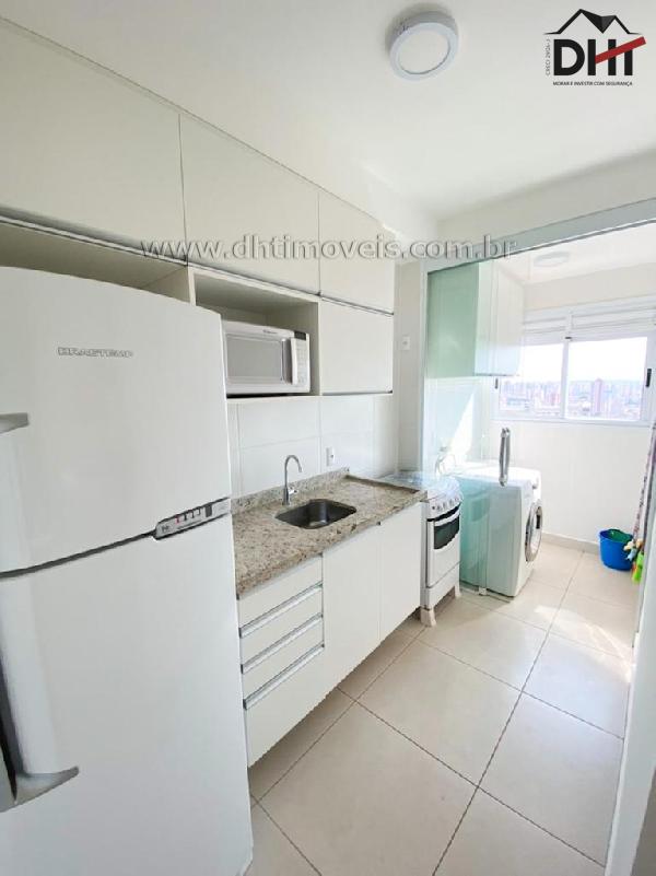 A sala possui sofá, painel, rack e TV na sala e mesa com 2 cadeiras. Cozinha planejada com geladeira, microondas e fogão. Lavanderia com máquina lava e seca.
