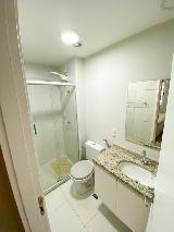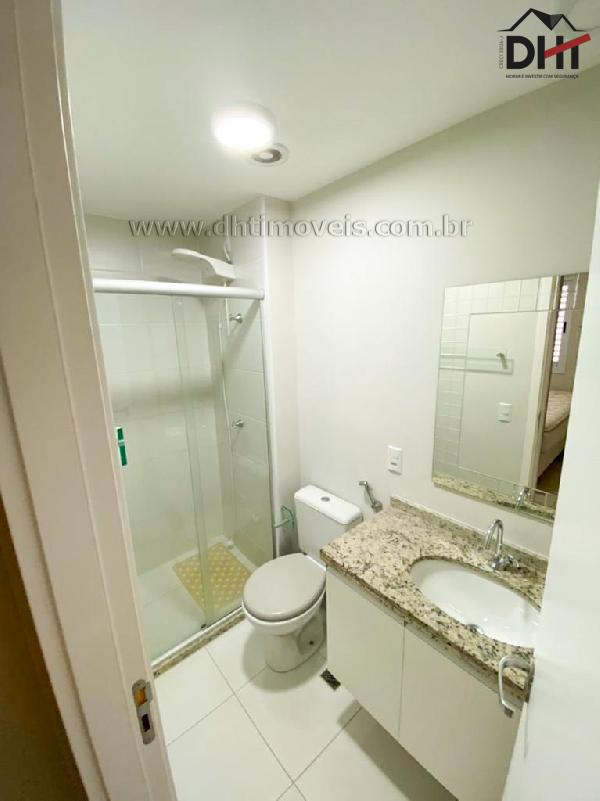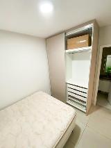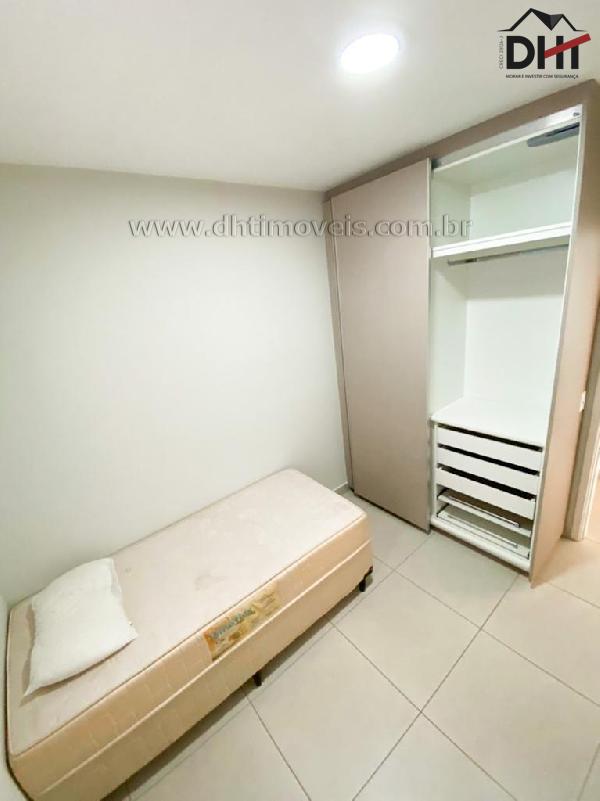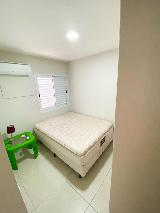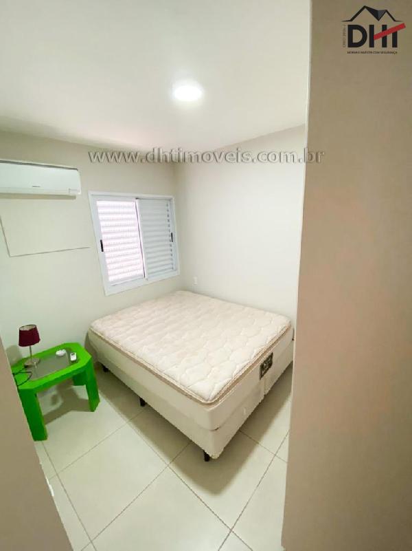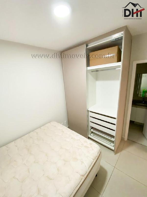 Suíte com cama de casal, armários, ar condicionado e banheiro com armários. Segundo quarto com cama de solteiro e armários. Banheiro social com armários.